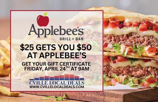 Double your deliciousness! With Cville Local Deals, just $25 gets you $50 to spend at Applebee’s! Snag your gift certificate Friday, April 24th at 9am — before they’re gone!