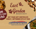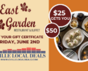 With Cville Local Deals $25 gets you $50 at East Garden! Get your gift certificate Friday, September 8th at 9am!